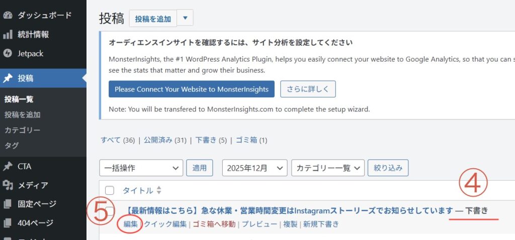 「投稿」→「投稿一覧」 をクリック - ひな形となる投稿を探します